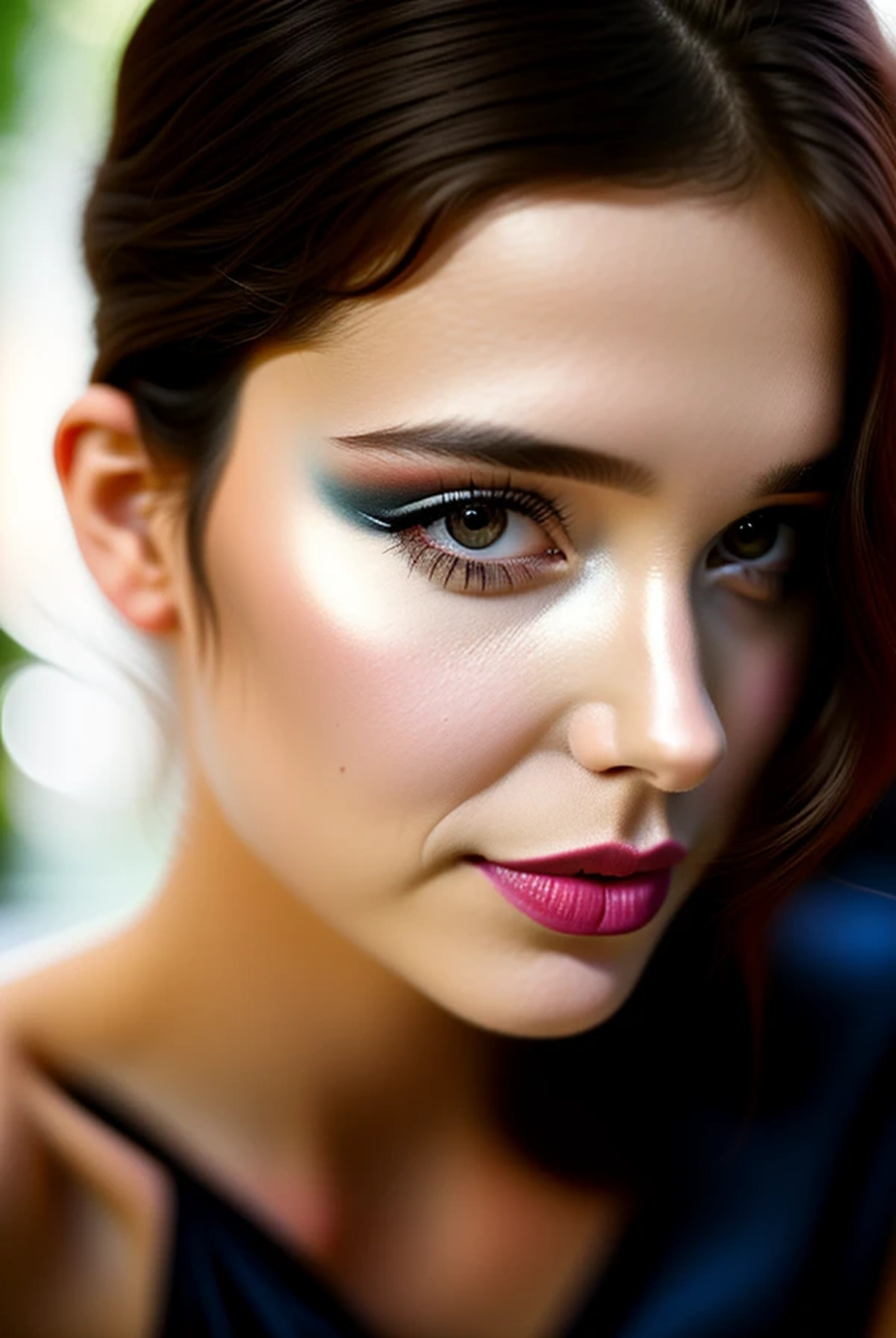 (((8K UHD extreme close-up of the eyes of a stunning brunette model with beautifully proportioned face and a short, sophisticated 1980s-style women's business hairdo, zoomed in so the eyes dominate the image; hyperrealistic detail; bright, diffuse lighting))), and showing off ((((every tiny detail of her intricate eyes, complex irises, sultry and sexy eye makeup, and makeup-enhanced skin)))). (((Superb macro-lens skin texture detail))), including (((wavy radial stroma in her irises))) and (((((highly-detailed heavy glamour make-up))))), including (((very glossy, sparkly frosted-pink lipstick))). (((Close-up of a smiling woman))) with ((((short, extremely dark red hair -- a wavy pixie cut that consists of thick layers of burgundy, raven-black and dark mahogany, giving it color depth and complexity))), then ((((trimmed in the style of artist Patrick Nagel's 1980s artwork of women with short, chic, angular, to-the-ears hairdos, with long diagonal, swooping and curling bangs almost obscuring her beautiful eyes)))). She has (((unusually large, round eyes that are pale blue-gray in color that dominate her face with their ethereal, haunting beauty))), and are enhanced with (((a 1/8"-wide stylized line of black eyeliner))) and (((dark bronze eye shadow on both upper and lower lids))). ((Pale foundation gives her skin a milky, flawless look, with light powder removing any glossy sheen)). The woman is in her mid-20s, and ((((wearing a beautiful midnight-blue satin cocktail dress)))). (((She is tall and slender,)) with (a runner's build -- lean, with a well-defined musculature -- and firm, shapely breasts). Facially, she's a mix of (Marie Osmond 3.8), (Agnetha Fältskog 2.5), (Julie Christie 2.5), (Ellesse Cheale 1.8), (Zooey Deschanel 1.8) and (Daisy Edgar-Jones 2.9), with (the nose of Olivia Newton-John 1.9) and (((upper front incisors that are set in front of the rest of the row, making them appear both larger and more prominent))). (Lips are thin and natural).