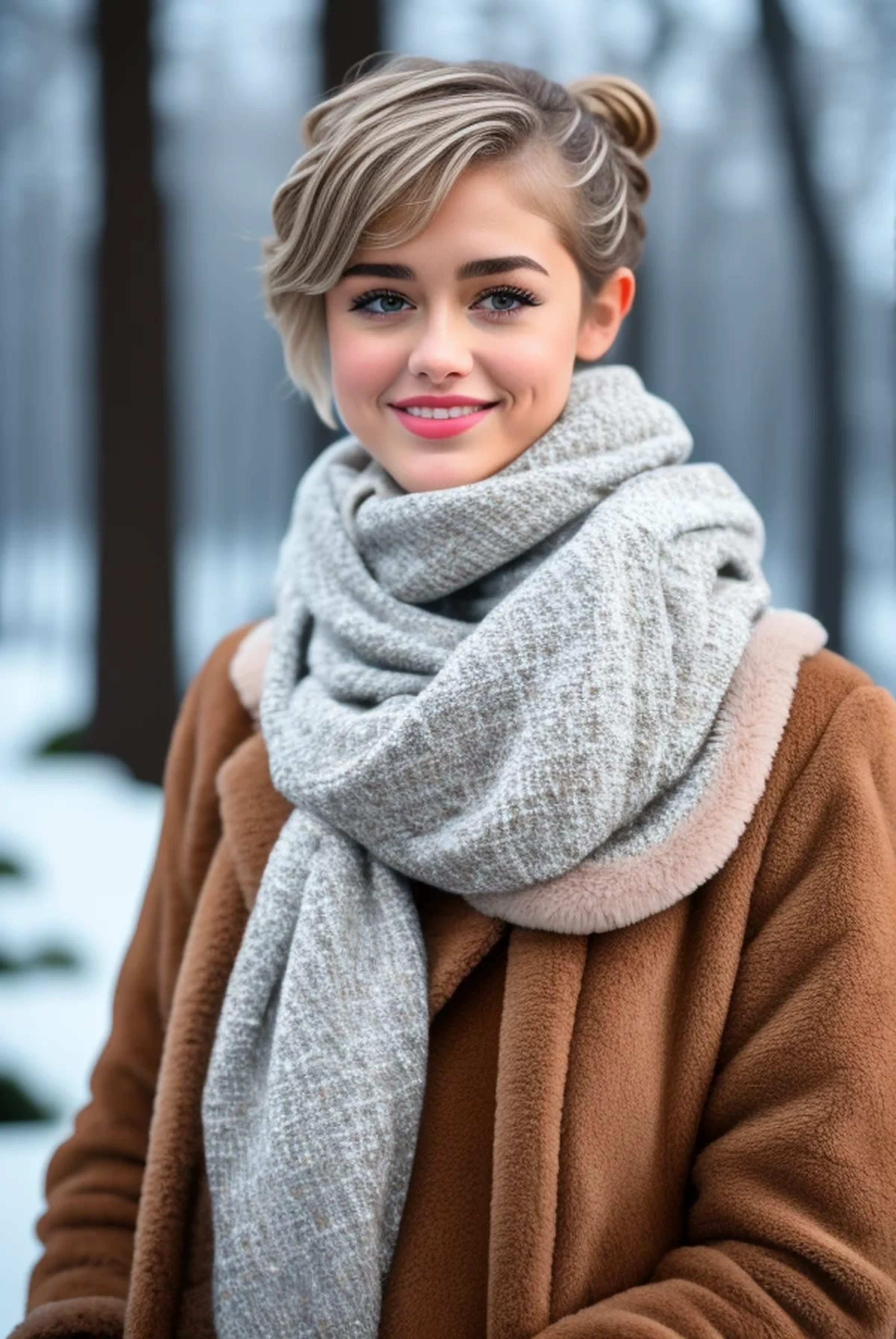 ((8K UHD, 50mm f2.8 Nikkor shot with bright but diffuse light on a snowy winter morning)) of a young (fair-skinned Caucasian) woman in a park. ((She has short, fine platinum blonde hair with silver highlights)) that's (((tapered on the sides and back, so her ears are completely uncovered 1.9))), but left (((about six inches on top for styling: lightly permed, then treated with hair gel and blown back from her forehead and face -- in effect, a wavy pixie cut that flows from the hairline back over the top of her head, like an icy river following the contours of her skull 1.9))). She has (soft, pale blue-gray eyes 1.8)) with (perfect round irises), (round, dark pupils), (long, thick lashes), ((a thick line of eyeliner 1.9)), and (glittering silver eye shadow 1.8). ((Her eye makeup is heavy, colorful and intense 1.9)) (Liberal use of concealer and dark pink blush on the crest of her cheeks gives her skin a smooth, flawless look). The woman is in her early twenties, and (((dressed in a white lace blouse and a Pendleton plaid wool scarf under an expensive full-length fur-trimmed brown leather winter coat 1.9))). (She is tall, slender and athletic). Facially, she's a mix of (Melanie Laurent 1.3), (Brittany Murphy 1.9), (Elizabeth Turner 1.8), (Ellana Bryan 1.4) and (Natalia Dyer 1.9), with (the eyes and nose of Olivia Newton-John 1.9) and (((the mouth and teeth of Noelle Brown 1.9))). She has (full, sensual lips, though the upper lip is less full than lower lip). She also has ((puffiness under her eyes and deep lines demarcating the bottom of those bags)), and ((lightly freckled skin, which is just barely visible through her makeup 1.9)). ((She has a significant overbite, with the front two teeth of the top row sit slightly forward of the rest and creating a very slight buck-toothed grin 1.3)). (She has long, fine eyelashes), pressed so the upper ones curl upwards. (Her lips show fine vertical lines), and are done up in (((Trophy Wife Crème frosted pink lipstick))).