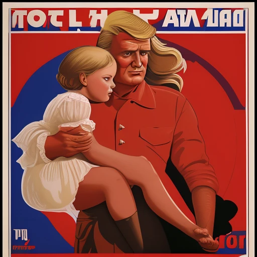soviet poster, Trump holds a girl in his...