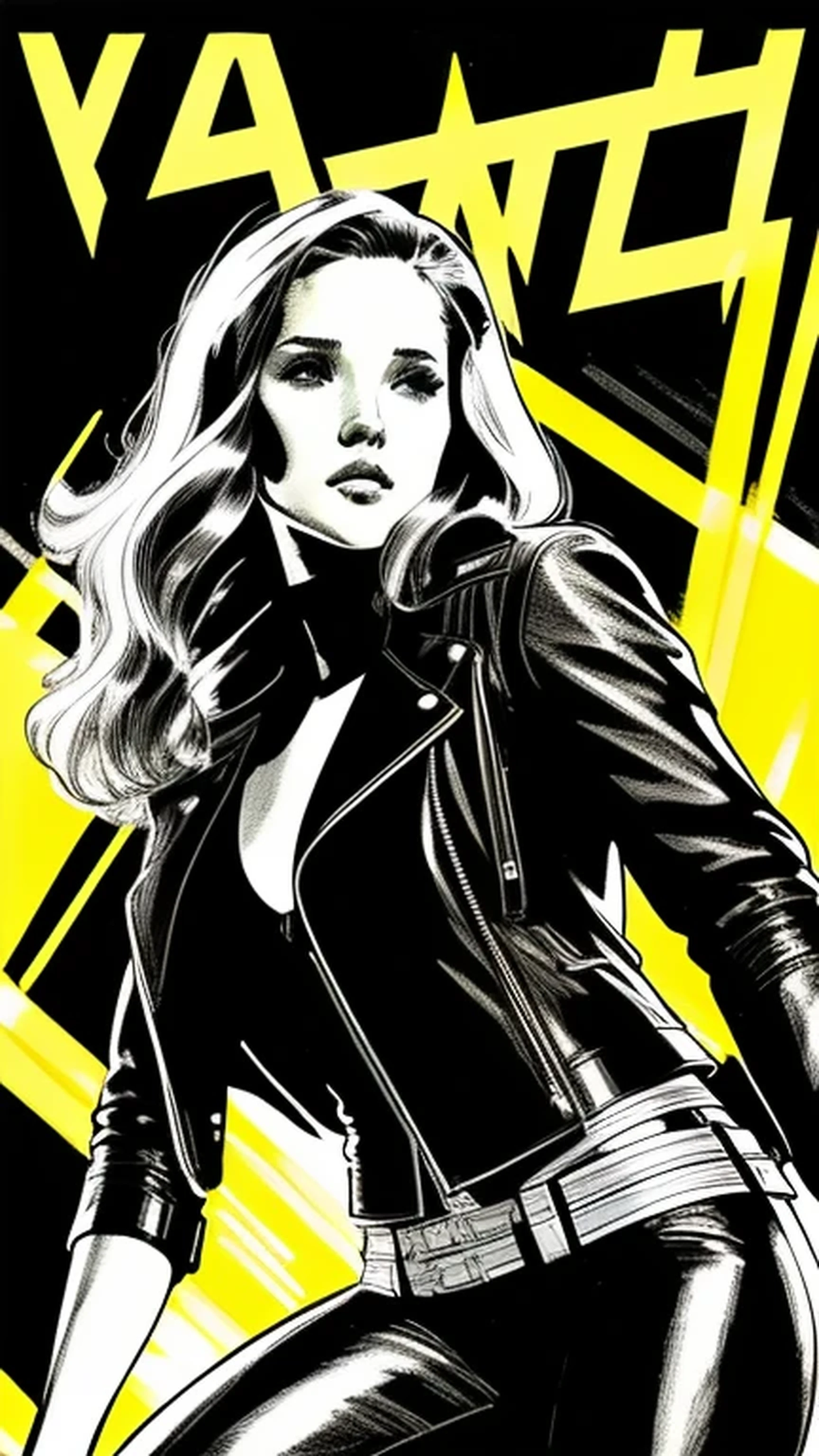 Yellow ink sketch, Jessica Alba in leather jacket, Figurative, Minimalism, Sunburst yellow, Under lit, Sean Gordon Murphy, Illustration, film noir, stunningly beautiful