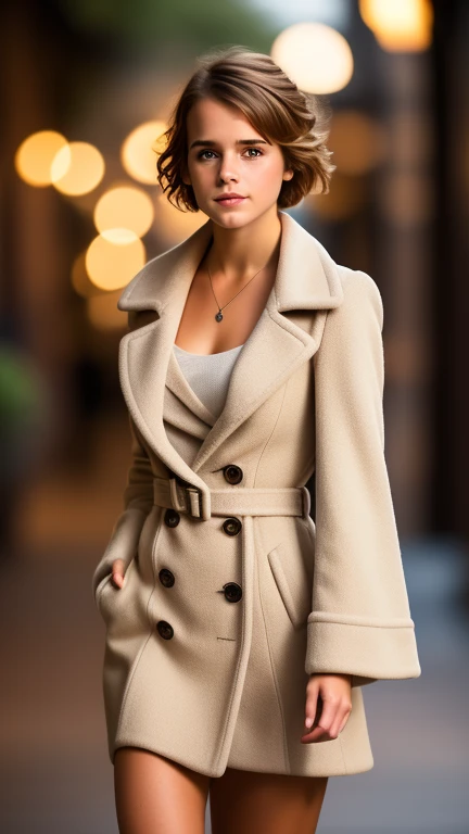 emma watson pixie cut hair long coat, short skirt, high sneekers, full figure, busty