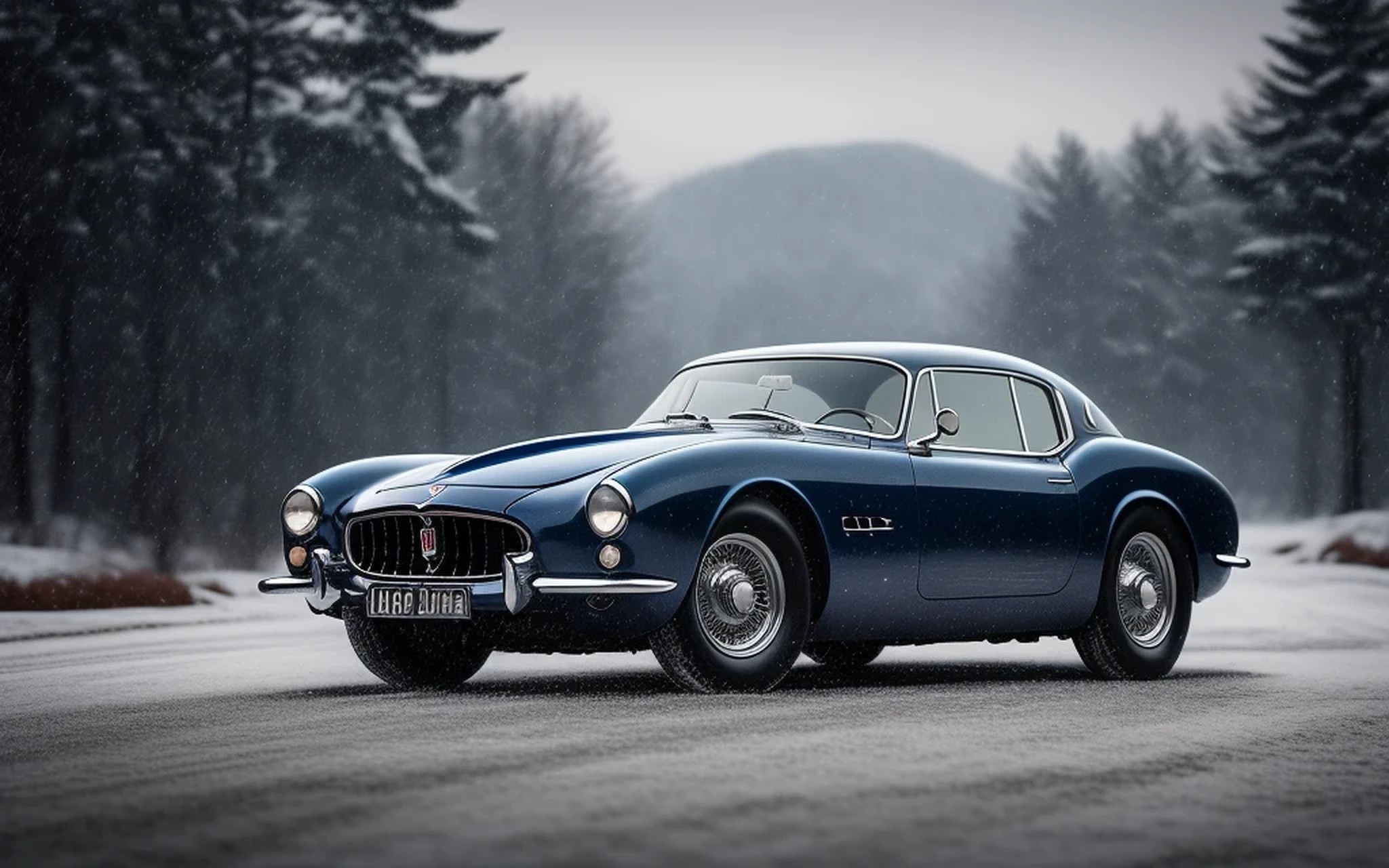 Vintage dark blue Maserati car circa 1950, in snowy landscape