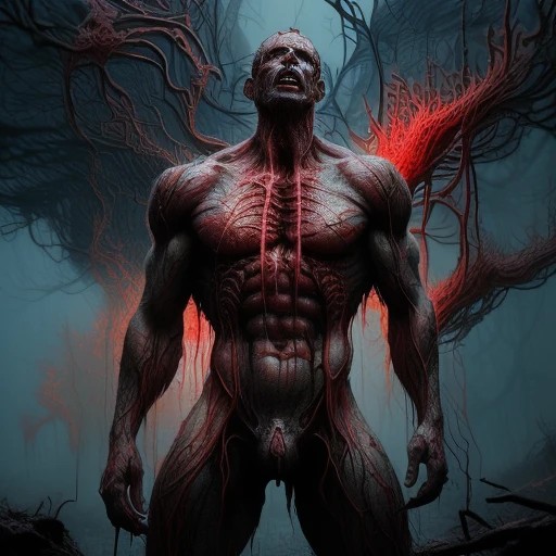 fighting game style masterpiece, best quality, ultra realistic,32k,RAW photo,detail skin, 8k uhd, dslr,high quality, film grain,\nShort and messy hair . dynamic, vibrant, action-packed, detailed character design, reminiscent of fighting video games, black bloody veins growing and intertwining out of the darkness, oozing thick neon rainbow blood, veins growing and pumping blood, vascular networks growing, connecting, explanding, red veins everywhere, zdzislaw beksinski, (vibrant colors:1.1), (Repetition:1.1), (Cross-hatching:1.1), (Infrared:1.2), Rust, Hypercube, ultra detailed, intricate, oil on canvas, ((dry brush, ultra sharp)), (surrealism:1.1), (disturbing:1.1), beksinski style painting, sparks, lensflare, rim lighting, backlighting, RTX, Post Processing, satanic cross, man body, muscular, venom costume