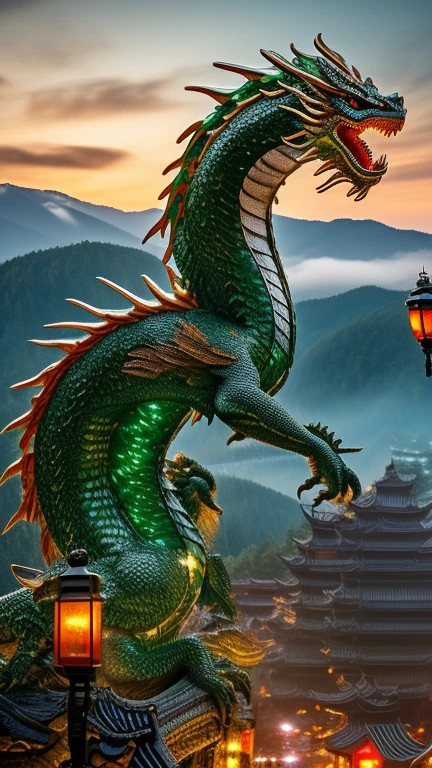 Create a detailed and intricate image of a ((large wooden green dragon)), symbolizing the upcoming 2024 Chinese New Year. This dragon should be depicted with a majestic and powerful stance, radiating a sense of strength and wisdom. Its scales are a (rich, deep green, resembling polished emerald), with intricate wooden textures visible upon closer inspection, giving it a unique blend of natural and mythical essence. The dragon's eyes are piercing and bright, possibly glowing, adding to its mystical appearance. It should be adorned with traditional Chinese motifs and symbols, like golden patterns or ancient script, that enhance its cultural significance as a New Year's symbol. The dragon's body is sinuous and elegant, coiling gracefully, with a long, flowing tail and a mane that looks like carved wood. It should be set against a celebratory background with festive elements like lanterns, fireworks, or red and gold decorations, typical of Chinese New Year celebrations. The overall style should be vibrant and dynamic, capturing the festive spirit of the New Year and the majestic beauty of the wooden green dragon