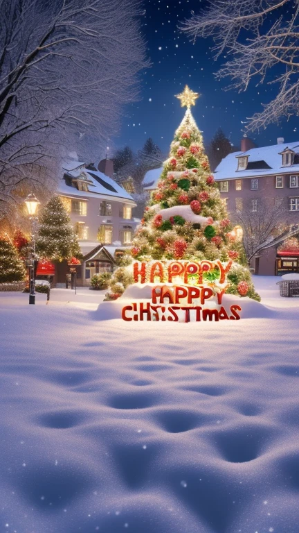Christmas scene background (('Happy Christmas')) [print on background] Solo, using a ((holiday_season font)), ((no poorly written text)), ((english language spelling only)), ((no incorrectly printed words)), ((no jumbled letters)), ((no extra letters added)), ((no duplicate words)), ((no extra words added)), ((literal)) ((detailed background)), highest resolution, highest quality,