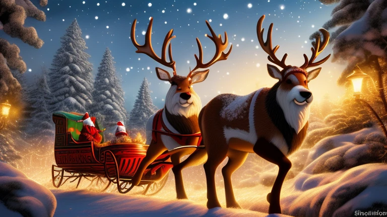 Draw a Disney style cartoon of Rudolph the Red-Nosed Reindeer, depicting in (full profile facing left) featuring large, branched antlers and using ((his luminous red nose)) to lead the (reindeer team) and guide ((Santa's sleigh)) on Christmas Eve. in 3d, ((realistic)), ((action poses)), ((detailed background)), ((detailed bodies)), ((detailed faces)), ((detailed hands)), ((highest resolution)), ((highest quality)), ((clothed))
