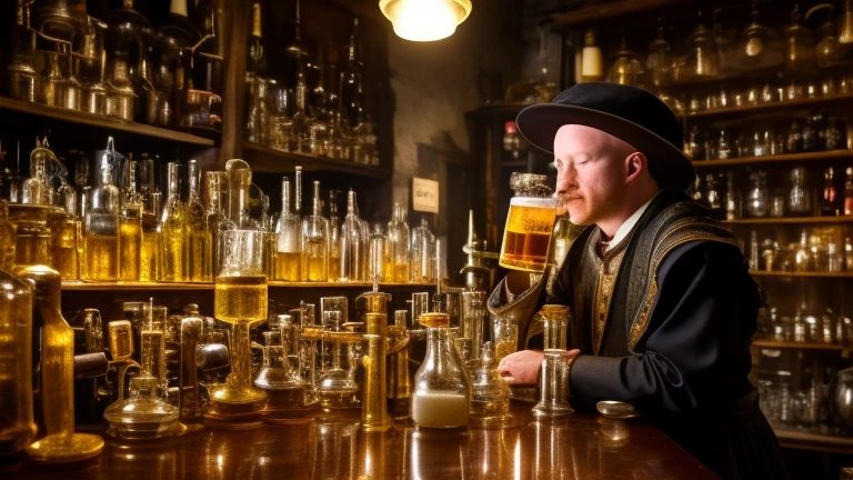 Alchemist Paracelsus is smelling beer glass in wonderful alchemist's laboratory full of tubes