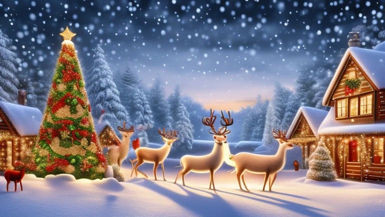Draw a cartoon Christmas scene background, then draw funny Christmas cartoon of reindeer in 3d on background, Solo, ((detailed background)), ((detailed bodies)), ((detailed faces)), ((highest resolution)), ((highest quality)),