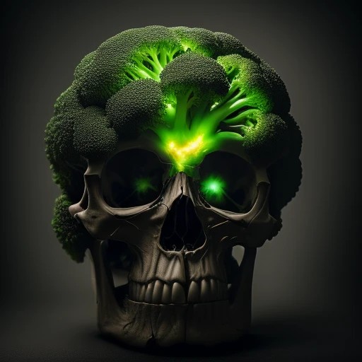 (photography:1.3), (RAW photo:1.3), human skull made of broccoli, dark background, backlight