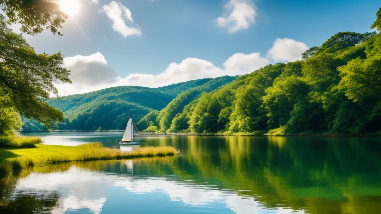pastoral scene of the lake, complete with a white ((sailboat gracefully)) gliding across the clear blue waters, set against a backdrop of lush greenery and rolling hills