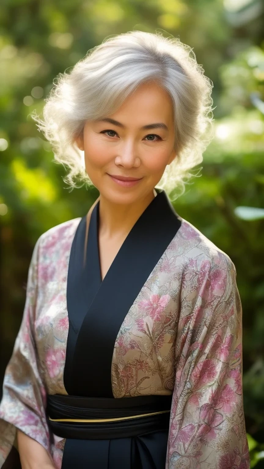 Create a highly detailed portrait of an older Japanese woman shy smile gently. she is wearing a traditional black silk kimono. The kimono is in shades of black. she has a sun-kissed skin. Her hair is short. The background is a soft, diffuse wash of colors that suggests a serene Japanese garden in spring, with hints of blooming sakura trees. The lighting is soft and natural, highlighting the textures of the kimono fabric and the contours of his face. Her eyes are warm and inviting, reflecting a sense of peace and contentment.