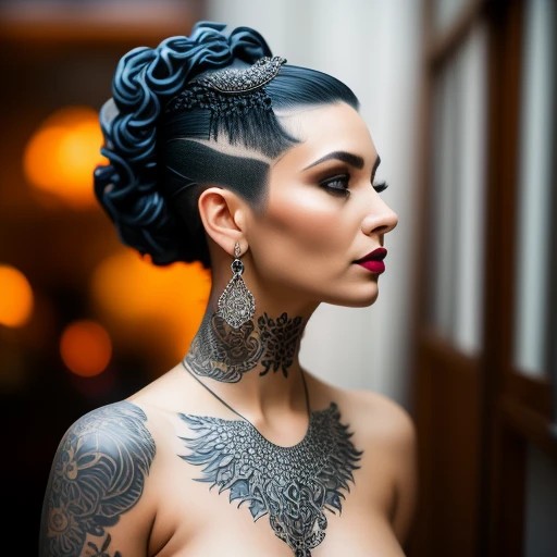 a woman with a dragon tattoo on her head, dragon scales in hair, style dan hillier, with an intricate, sleek dragon head, well designed female dragon head, dragon scales across hairline, style of ink, with a tentacle tattoo, insanely nice hair style, unique hair designs, undercut, undercut haircut, short hair on sides of head, silver jewellery