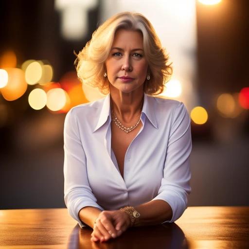 60 year old dame Helen Mirren (long face:1.4)blue jean pants and a white man's dress shirt(((Photorealistic))),(showing full body) ((Stephanie Seymour,)) (((ultra detailed))) (nighttime), 8k uhd