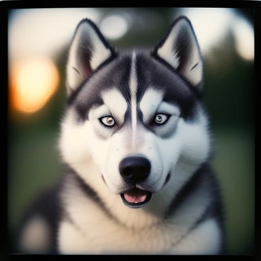 Close-up polaroid photo, of a husky, soft lighting, outdoors, 24mm Nikon Z FX