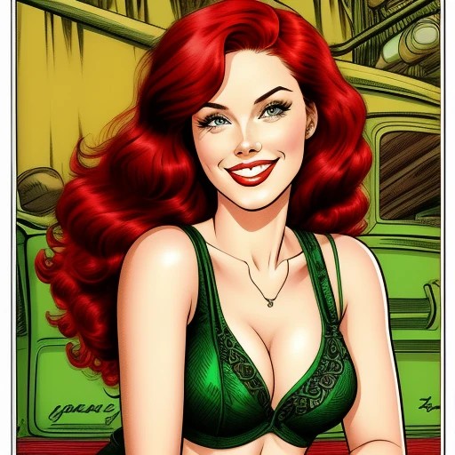 Red haired Woman with green eyes smiles ((Pin Up style))