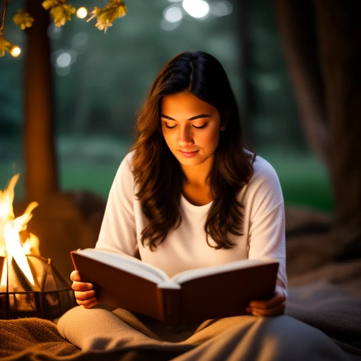 Beautiful woman, Asian, black hair, full body, pixel art, animation, sepia color, pastel tones, reading a book, barefoot, sky blue jeans, background with green grass under a large tree, camping tent, inside the tent there is only a small lantern, snowy winter night, stars falling on a winter night, a softly burning campfire, a small Persian cat next to campfire, food next to the campfire, wearing a white t-shirt, and white shorts,