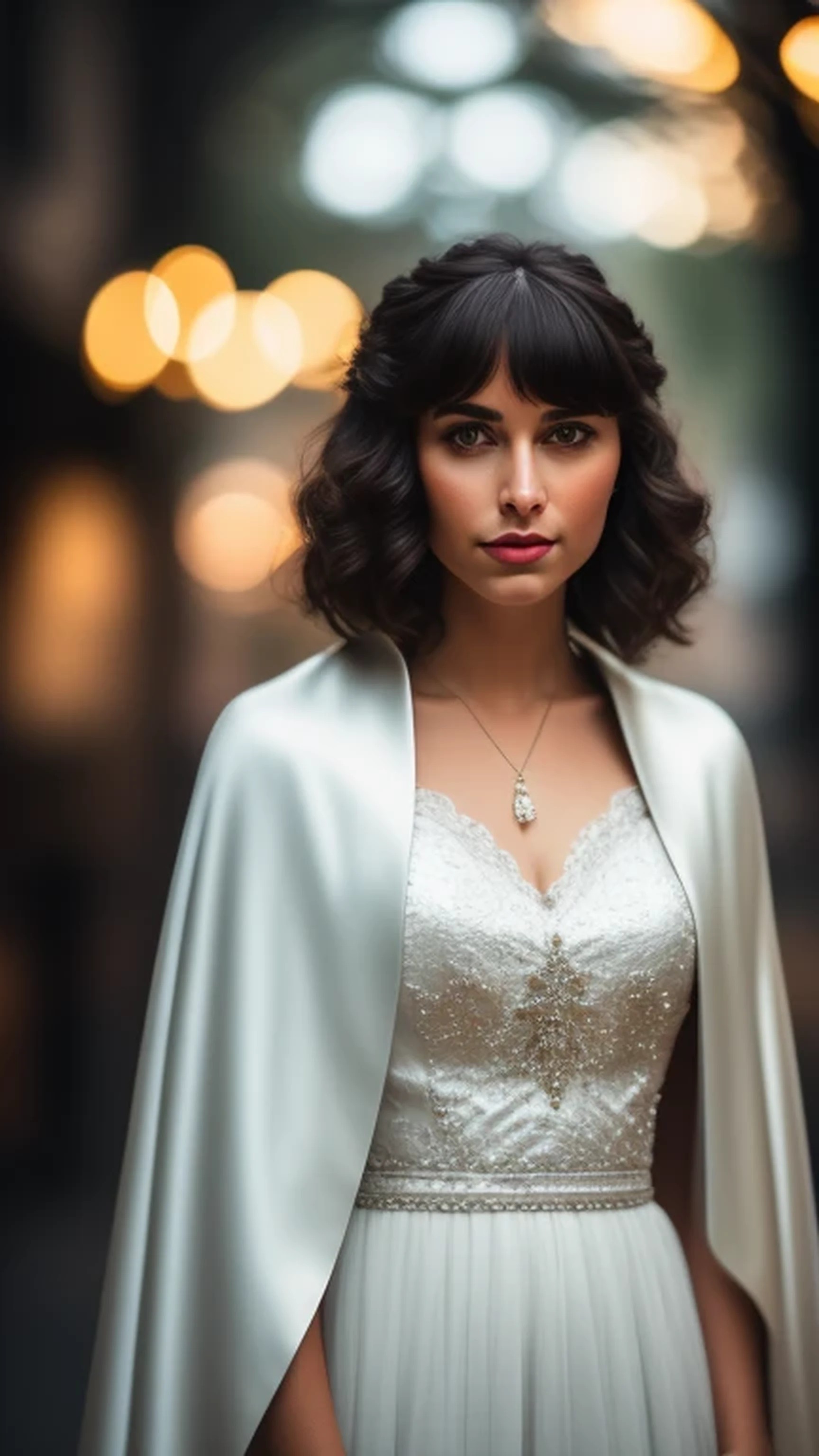 Gorgeous 30-year-old French sisters, standing with white stained silk cape, eyes closed, short hair with bangs, creepy setting, dim lights, stunningly beautiful, hight detailed, sharp focus, hyperrealistic
