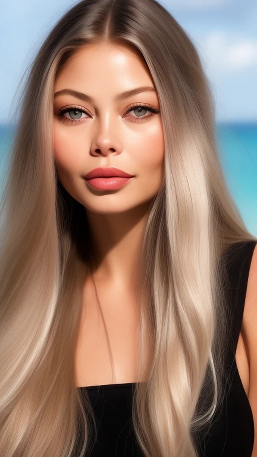 (((Photorealistic))) and highly-detailed portrait of (((actress ornella muti))) on a beach and wearing a ((black bikini.)) Her (((long brunette hair sports bright blonde highlights, with platinum tresses framing her face.))) She is smiling -- a faint, uncertain smile, as opposed to a broad grin. She is wearing dark eye shadow, and her full lips are painted a light, glossy pink. The image is highly detailed, with individual pores almost perceptible on her face and the hair containing enough detail to see the individual strands of hair. Her skin has a slight oily sheen in places, like on her cheekbones, from tanning oil. A few strands of wind-blown hair partially obscure her left eye. There is enough detail in her lips to make out the vertical lines, as well as the slightly darker pink lip liner. ((Her eyes have dark brown irises, rimming black pupils.)) The whites of her eyes have tiny capillaries, lending a little more texture and color variation than pure white.