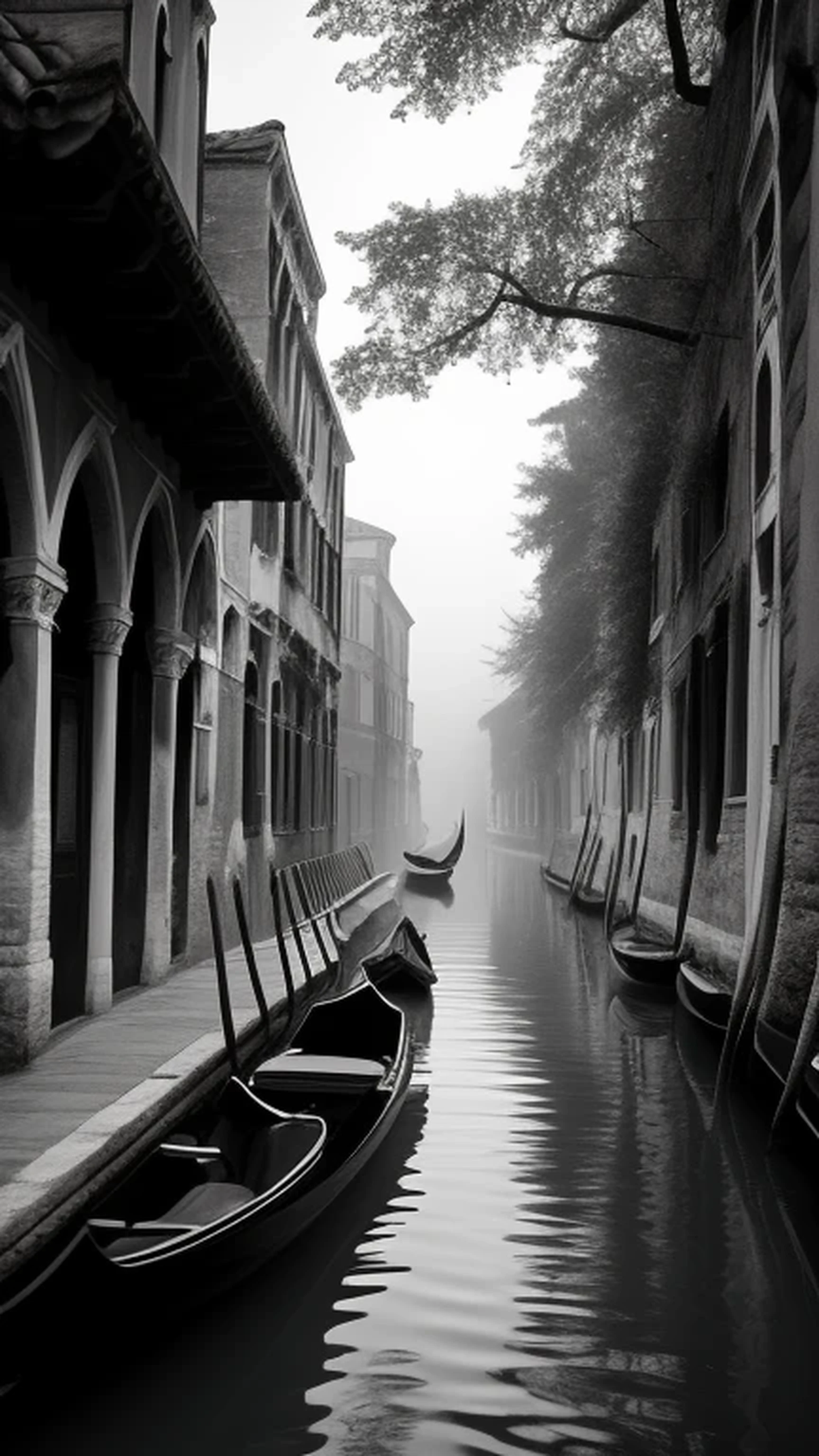 Abandoned Venice city canal, at the dead of night, palazzos and gondolas destroyed, foliage everywhere, fog, black and white engraving