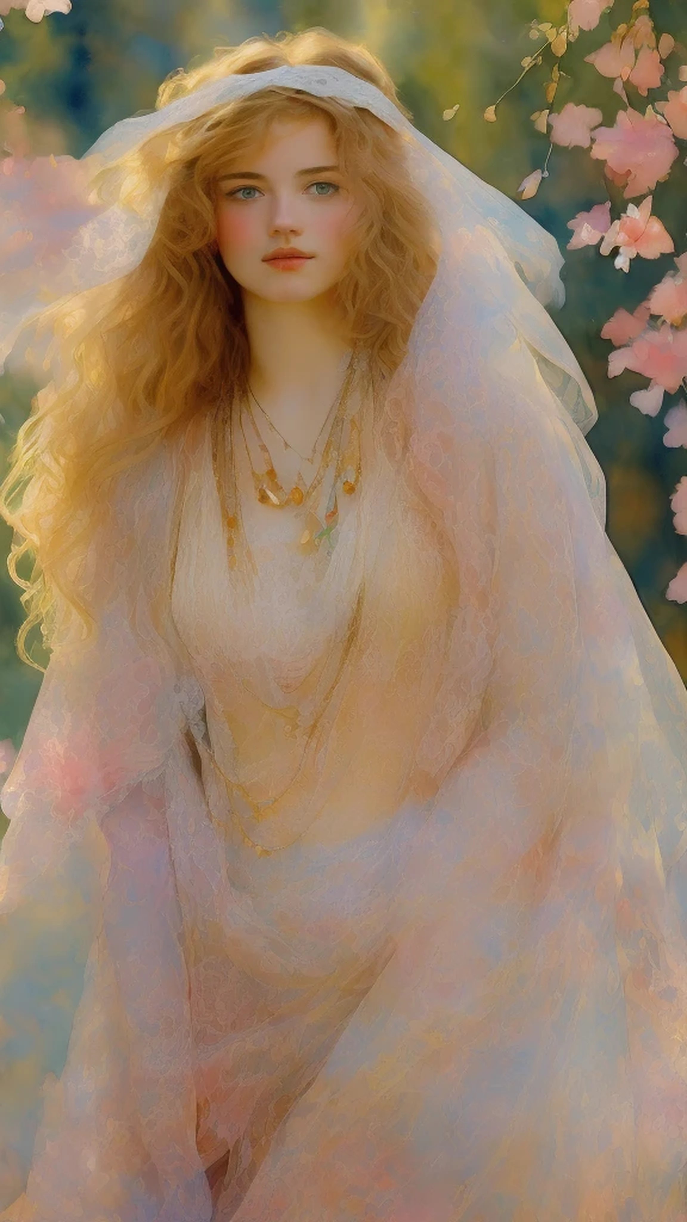 ((((highly detailed)))) ... (((John Singer Sargent)))... (((Watercolour))) ... ((lascivious young woman)) ((with lace and colorful veils)) ((pearl necklace with butterfly pendant))(flowers in blond hair) Crosses winter forest