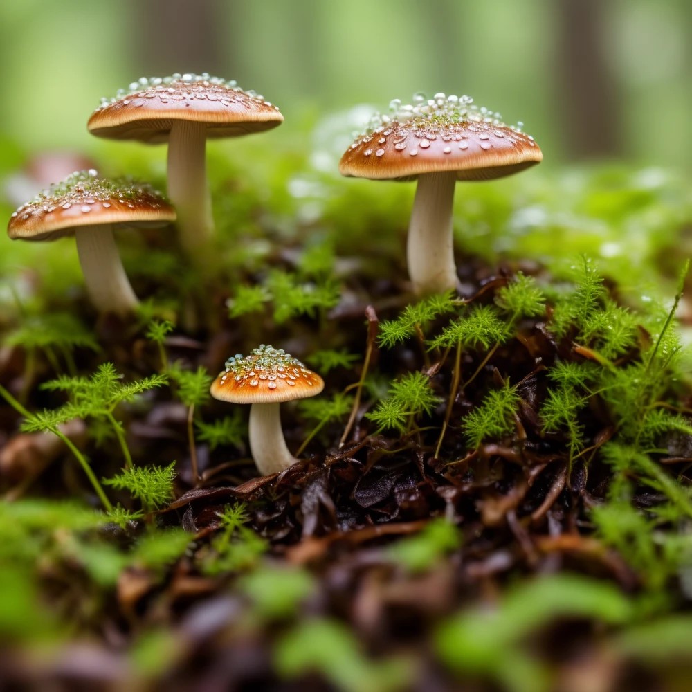 mushroom in spring forest with lots of tiny green eyes with black eyelashes on top