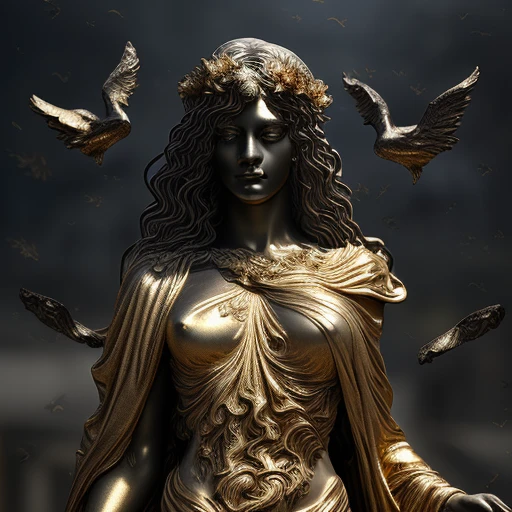 masterpiece, best quality, epic realistic, (black_marble) (goddess_statue), plate on head, (black wing:1.3), intricate detail, intricate pattern, golden dust, floating (golden cloth), detailed texture, broken glass, god light, ((crow)), ((golden birds fly)), golden rose, golden leaf, motion blur, depth of field, holographic