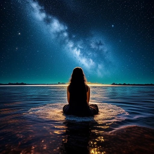 Indian Women speaking to god and undergoing realisation, she wishes to tell the world the secret, all this happens in the universe where black is covered with diamond stars,, down huge ocean is flowing