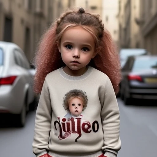 bambino di tre anni corre sulla strada. Il bambino ha un gatto fra i capelli. Il bambino è vestito con un maglione rosso