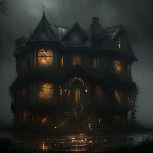 In the night, a girl stands,behind her a haunted abandoned house looms,curled with ivy,rain, flash lightning,its eerie silhouette against a dark sky,fog,lights,poster,Ellen Jewett , masterpiece