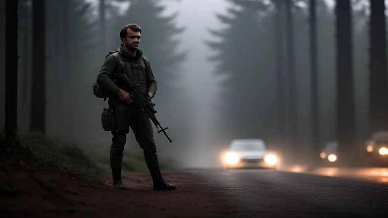 Macron as the Rambo, standing with machi...