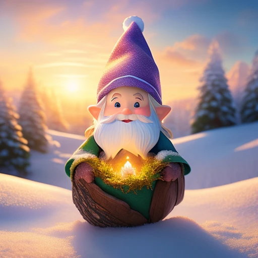 little gnome with big eyes living in acorn, snowy landscape, sunset