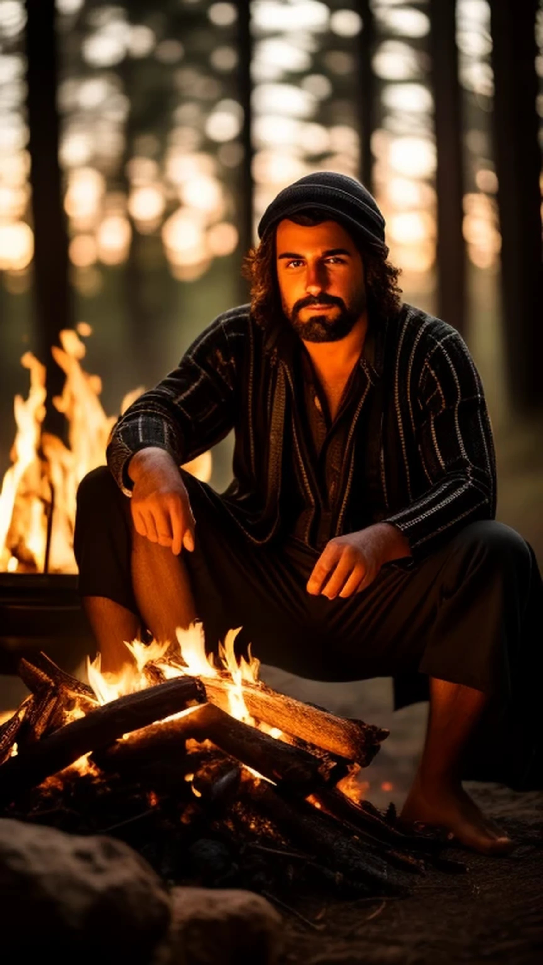 (black and white), Gypsy man, near campfire, full length, high resolution
