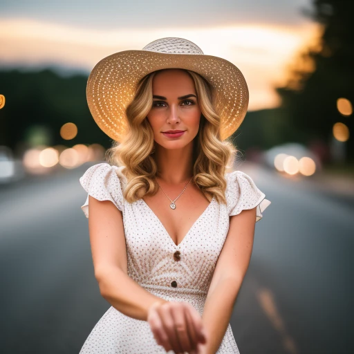 mom wearing a white polka-dot dress and wide brimmed straw-hat riding a 1960's Vespa motor scooter ((Photorealistic)), ((Detailed Face)), ((High Cheekbones)), ((Detailed Hands)), ((Feminine Hands)), ((Action Poses)), ((8k)), ((uhd))