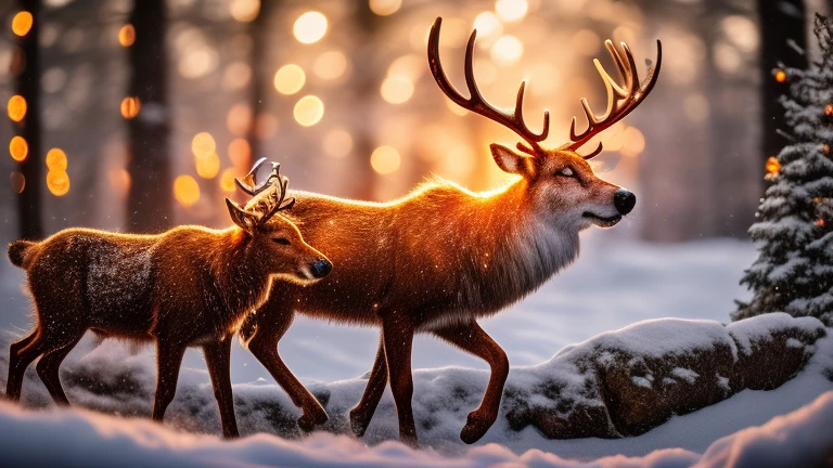 Rudolph the Red-Nosed Reindeer, depicted in full profile featuring large, branched antlers and using his ((luminous red nose)) to lead the reindeer team and guide ((Santa's sleigh)) on Christmas Eve. in 3d, ((realistic)), ((action poses)), ((detailed background)), ((detailed bodies)), ((detailed faces)), ((detailed hands)), ((highest resolution)), ((highest quality)), ((clothed))