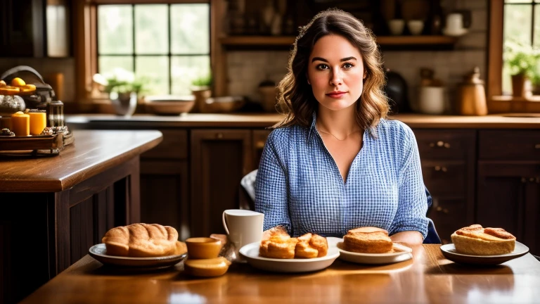 The image depicts a scene from a film set in a rustic kitchen, with an atmosphere that conveys a sense of mid-20th-century rural life. The central figure is a woman seated on a wooden table. She is dressed in a short-sleeved, gingham-patterned dress that’s hitched up to reveal her knees, and she is wearing dark stockings. Her posture is relaxed, and she appears to be in mid-movement, perhaps caught off-guard or in a moment of contemplation. Around her, the kitchen has an authentic, lived-in look with loaves of bread and a bowl on the table, suggesting a setting that’s deeply connected to traditional cooking or baking. The lighting casts a warm hue over the scene, highlighting the textures and enhancing the nostalgic ambiance.