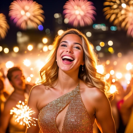 New Years Eve Fireworks Celebration Party Revelers Dancing in foreground ((Over-the-Shoulder Shot)), ((perfect smile)),((perfect teeth)), ((action poses)),