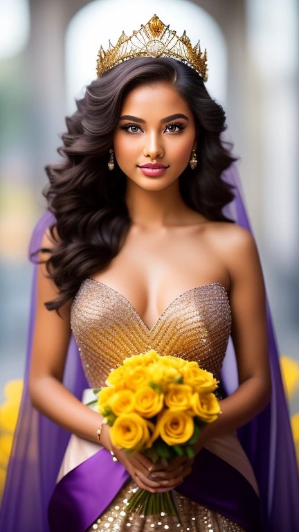 Miss NEW YEAR 2024 pageant, attractive young woman in her 20's, Eveningwear Style, wearing a ((single purple sash)), and ((diamond encrusted tiara gold crown)), holding bouquet of yellow roses, dark skin, natural look, hazel eyes, light brown hair, upper torso portrait, blurred background, natural light, photograph, detailed -- ultra sharp focus, award-winning photograph Canon EOS 5D Mark IV DSLR, f/8, ISO 100, 1/250 second