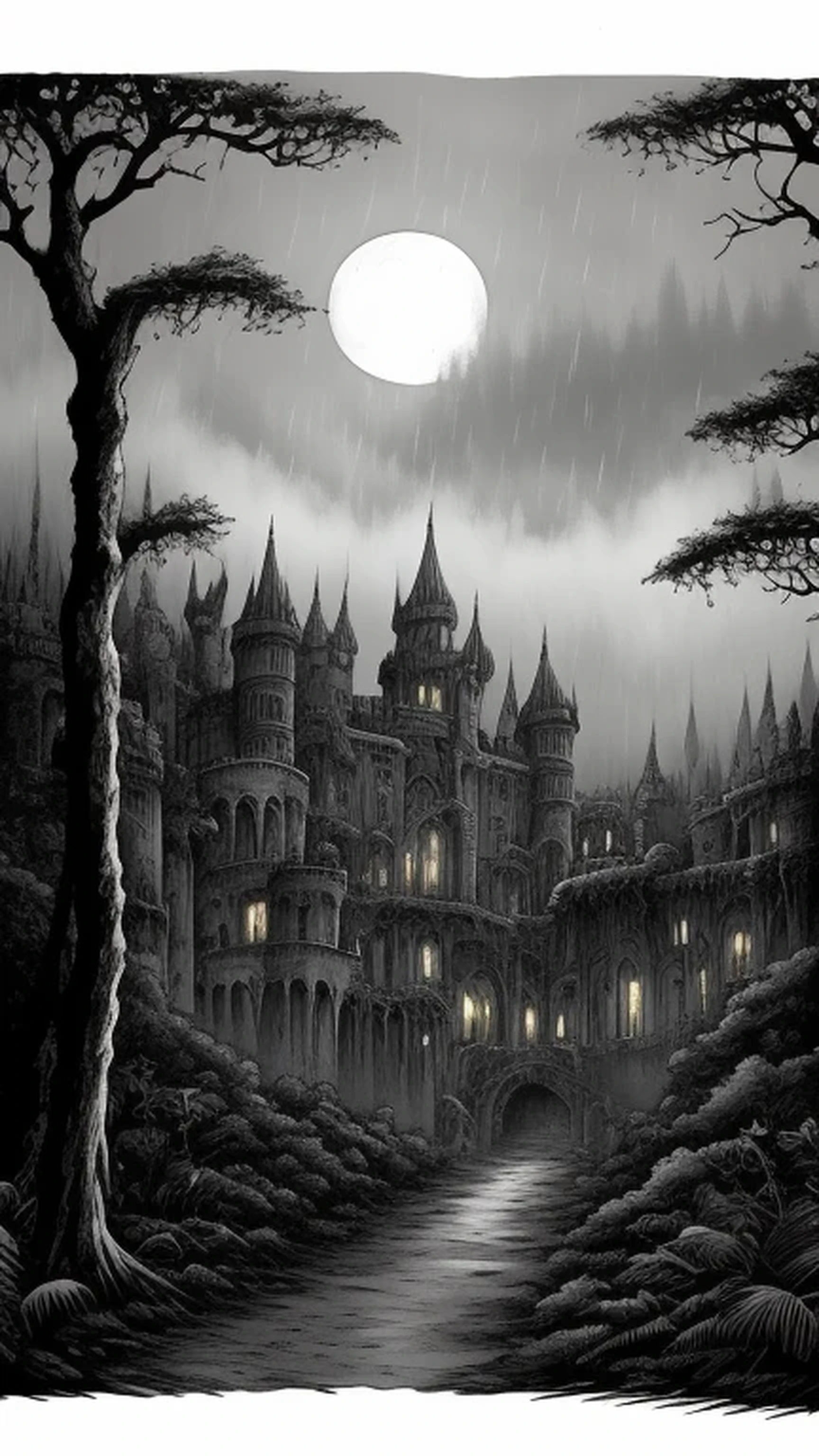 Ominous derelict castle far beyond a haunted rain forest at midnight, dark clouds, moonlight, foggy atmosphere, twisted trunks, mutated bushes, creepy silhouettes, dark shadows