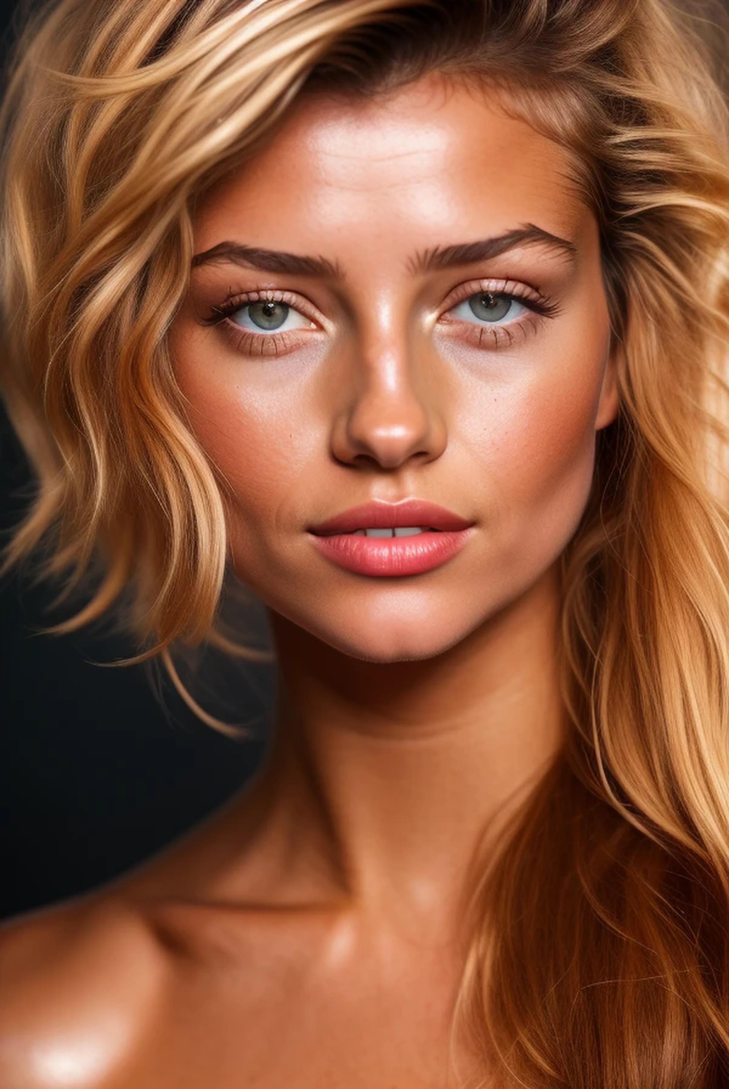 ((((Exceptionally sharp, precise and superbly-detailed 8K UHD SDXL photorealistic Vogue Magazine glamour close-up)))), matching (((((the unsurpassed image quality and unmatched realism of the SDXL model, epiCRealism Natural Sin RC1 VAE))))); focused on the (((((intricate pale blue-gray eyes))))) of (((a very pretty young woman))). Superb (((((high-resolution skin texture detail makes even the tiniest laugh lines and crows feet visible; anatomically-correct eye detail))))), including (((((((precise rendering of the radial fibrovascular stroma that give her irises their complex coloration and texture))))))); ((((((ultra-fine delineation of even the faintest individual hairs)))))). A (((young Caucasian woman))) with (((a beautifully-proportioned oval face))) ((smiling at the camera)). (((She is wearing heavy glamour makeup))): (dark bronze blush); ((((gleaming dark bronze metallic-sheen eye shadow)))); ((((a 1/6"-wide and dominant line of black eyeliner tightlining the entire eye)))); ((mascara on long pressed and curled lashes)). She is dressed in a (((bodycon sleeveless bronze lame dress))). (((Her hair has been dyed a dark, lustrous black, gleaming in the sun like an obsidian sculpture))), ((((worn in a lush shoulder-length Marilyn Monroe-style bouffant flip hairdo, with gorgeous wavy S-shaped bangs dipping down to partially obscure her eyes)))). (((Her eyes are unusually large, round, and pale blue-gray))), eyes with (perfect round irises), (round, dark pupils), and (long, thick lashes). ((Her skin is tanned, and her darker foundation gives her near-flawless skin a swarthy, Mediterranean tone)). She is in her early to mid-20s. Facially, she's a mix of (Léa Seydoux 1.8), (Nastassja Kinski 1.8), (Brittany Murphy 1.9), (Ellesse Cheale 1.8), (Lydia Bielen 1.8) and (Natalia Dyer 1.9), with (the nose of Olivia Newton-John 1.9) and (((the prominent upper front incisors of Aimee Lou Wood))). She has (((noticeable dark, puffy bags under her eyes))).