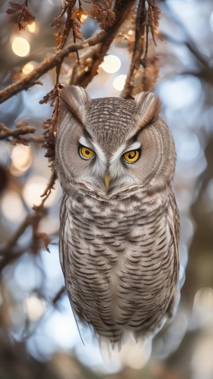 owl upside-down hanging from a branch