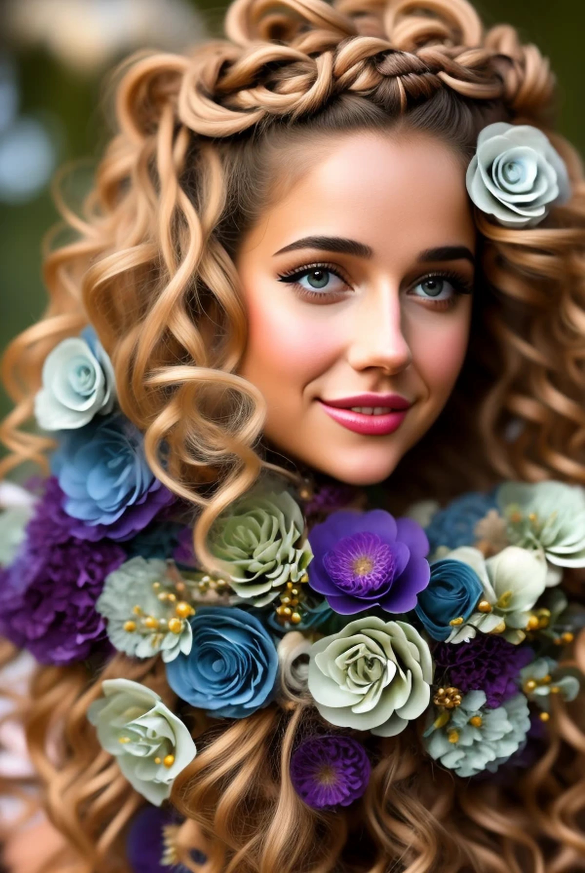 (((((Exceptionally sharp, precise and superbly-detailed 8K UHD SDXL ultra-realistic facial close-up))))), matching (((((the unsurpassed image quality and unmatched realism of the SDXL model, epiCRealism Natural Sin RC1 VAE))))); focused upon the ((((beautiful pale blue-gray eyes)))) of (((a very pretty young woman))). Superb (((((high-resolution skin texture detail and anatomically-correct eye detail))))), including (((((precise rendering of the radial fibrovascular stroma that give her irises their complex coloration and texture))))). A (((young Caucasian woman))) with (((a beautifully-proportioned oval face))) ((smiling coquettishly at the camera)). (((She is wearing heavy glamour makeup, with particularly noticeable eye makeup))): (dark bronze blush); ((((gleaming dark bronze metallic-sheen eye shadow feathered up to her eyebrows)))); (((a 1/6"-wide smudged line of black eyeliner outlining the entire eye, so her eyes are ringed with black)))); ((mascara on long pressed and curled lashes)). She is dressed in ((((a one-off fashion show designer dress made of large and colorful silk flowers stitched together to form the sum and substance of a vibrant "organic" form-fitting floral dress)))). (((Her mid-back-length hair is dyed a dark burgundy with honey-blonde highlights))), and ((((worn in an stunning updo that combines a Bantu knot-out ultra-curly hairdo with 18th Century Marie Antoinette formalism and ornate elegance)))). (((Her eyes are unusually large, round, and pale blue-gray))), eyes with (perfect round irises), (round, dark pupils), and (long, thick lashes). ((Her skin is tanned, and her foundation is keyed to that darker color, giving her near-flawless skin a swarthy, Mediterranean tone)). She is in her early to mid-20s. Facially, she's a mix of (Paula Zahn, circa 2000 1.8), (Daniela Melchior, circa 2014 1.8), (Brittany Murphy 1.9), (Linda Blair, circa 1990 1.8), and (Sharyl Attkisson, circa 1993 1.8).