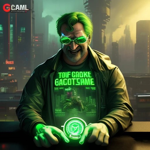Cyberpunk Gabe Newell, bright green text on shirt says, "G Money", laughing, steam summer sale, hacker, Gaben has all your money, glowing green dollar sign for eyes, greed, holding money in his hand, futuristic, sci-fi, glowing green mechanical glove, cityscape, rooftop, luxury suite, thumbs up, cyberpunk, cyberpunk art, perfect light,