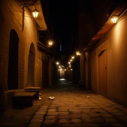 an alley of a medieval town at night wit...