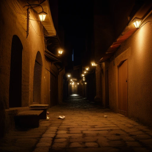 an alley of a medieval town at night with no people and two shoes lying on it