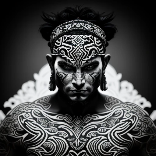 Black and white vector illustration of a fierce warrior with tribal tattoos, wearing a headband with his hands gripping a sword, determined eyes, intricate patterns on skin, 3D grid lines, hyperdetailed, high contrast, high resolution, cinematic lighting