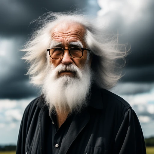old man with a lot of hair looks at cloudy sky with dark clouds