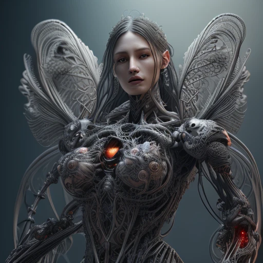 complex 3d render ultra detailed beautiful death angel, biomechanical cyborg, analog 150 mm lens, beautiful natural soft rim light, crystal feathers, roots, fine foliage lace, colorful details, Boris Bidjan Saberi outfit, pearl earrings, piercing, art nouveau fashion embroidered, intricate details, mesh wire, mandelbrot fractal, facial muscles, cable wires, microchip, badass, hyper realistic, ultra detailed, octane render, volumetric lighting, 8k post-production, red and white with a bit of black, detailled metalic bones, semi human, iridescent colors, Glenn Brown style, futuristic room, power of the god, high-angle shot, complex body poses