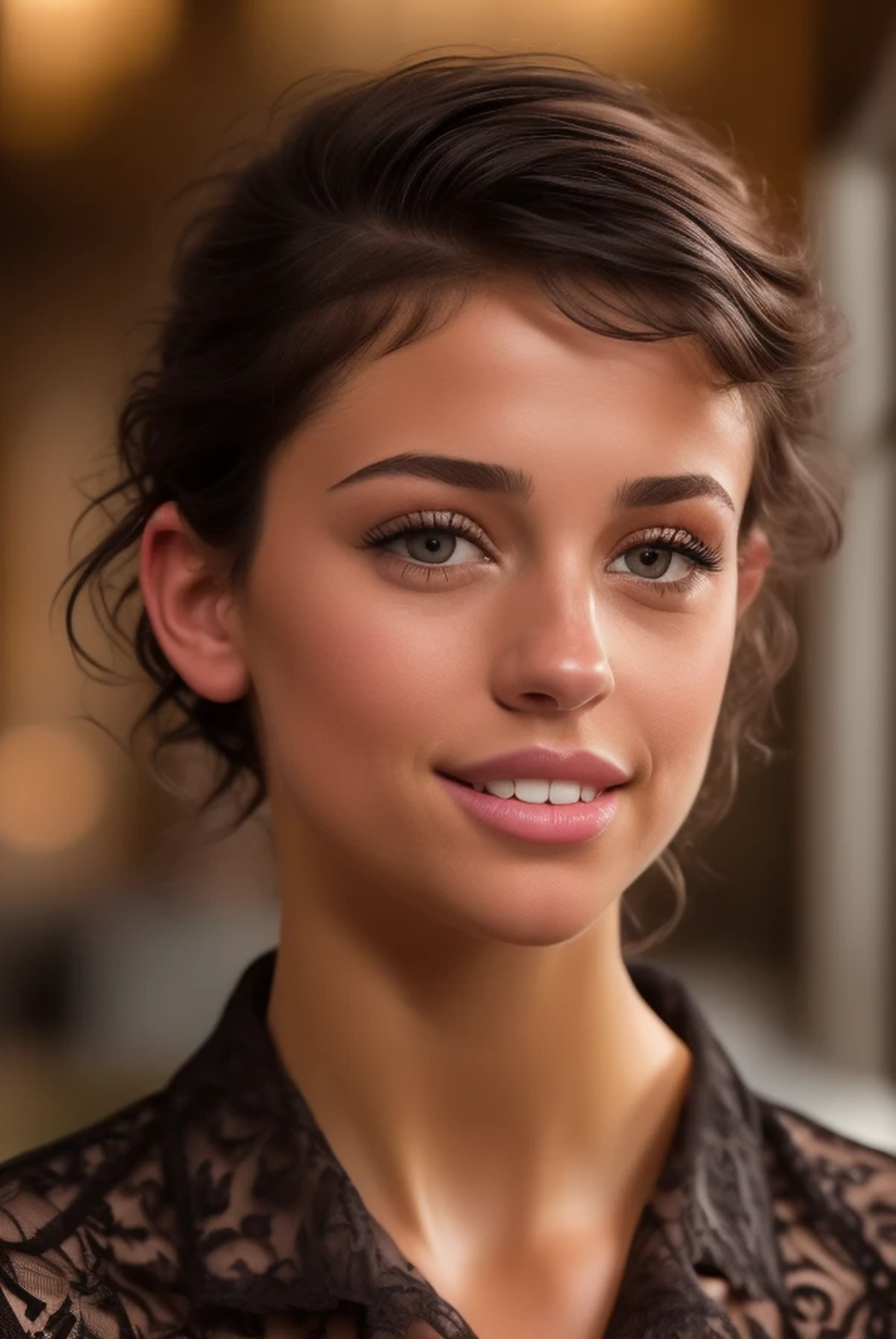 ((High-resolution Associated Press close-up portrait)) of a young (fair-skinned Caucasian) woman in a bar, wearing ((intensely colorful and theatrical lipstick and eye makeup)): ((((glittering plum eye shadow, turning eyelid to eyebrow a rich dark purple)))), and a ((((thick, glistening layer of Trophy Wife Crème frosted pink lipstick))). (((She has fine, short raven black hair -- hair tapered on the sides and back, so her ears are completely uncovered 1.9))), but left ((about six inches long on top for styling: lightly permed, then treated with hair gel and blow-dried straight back from her forehead and face -- in effect, a wavy brunette pixie cut that flows from the hairline back over the top of her head, like a windswept, river of oil following the contours of her skull, until finally dovetailing at the nape of her neck 1.9)). She has (soft, pale blue-gray eyes 1.8)) with (perfect round irises), (round, dark pupils) (long, thick lashes), enhanced with ((thick mascara and a heavy line of black eyeliner outlining her entire eye 1.8)). (Liberal use of concealer and dark bronze blush on the crest of her cheeks gives her skin a smooth, flawless look). The woman is in her early twenties, ((dressed in a sheer black lace blouse 1.9)). (She is tall, slender and athletic). Facially, she's a mix of (Melanie Laurent 1.3), (Brittany Murphy 1.9), (Elizabeth Turner 1.8), (Ellana Bryan 1.4) and (Natalia Dyer 1.9), with (the eyes and nose of Olivia Newton-John 1.9). She has (full, sensual lips, though the upper lip is less full than lower lip). She also has ((puffiness under her eyes and deep lines demarcating the bottom of those bags)), and ((lightly freckled skin, which is barely visible through her makeup 1.9)). ((She has a significant overbite, with the front two teeth of the top row sit slightly forward of the rest and creating a very slight buck-toothed grin 1.3)). (Her lips show fine vertical lines beneath the lipstick).