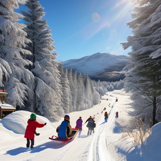 Rear view of children sledding (otherwise known as a toboggan or sledge) down snowy hillside background ((3d)), ((ultra-realistic)), ((action poses)), ((detailed background)), ((detailed bodies)), ((detailed faces)), ((detailed hands)), ((surrealistic)), ((highest resolution)), ((highest quality)), ((clothed)), ((zoom-in: 1.00))