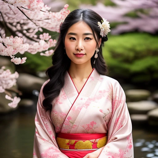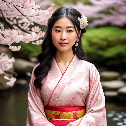 A young Japanese woman stands serenely under the delicate pink blossoms of a sakura tree, which signify her cultural heritage. She is dressed in a traditional kimono with a pattern of chrysanthemums, the national flower of Japan, and cranes, symbolizing longevity and good fortune. Her hair is styled in a classic shimada hairstyle, adorned with kanzashi hair ornaments that are indicative of her non-married status. The woman's makeup is subtle yet unmistakable, with a natural base and just a hint of red on her lips, reflecting the Japanese aesthetic of simplicity and understated elegance. She holds a sensu, a folding fan, featuring ukiyo-e art, which adds to the cultural authenticity of the scene. The background is a tranquil Japanese garden with a koi pond, adding to the peaceful and unmistakably Japanese setting